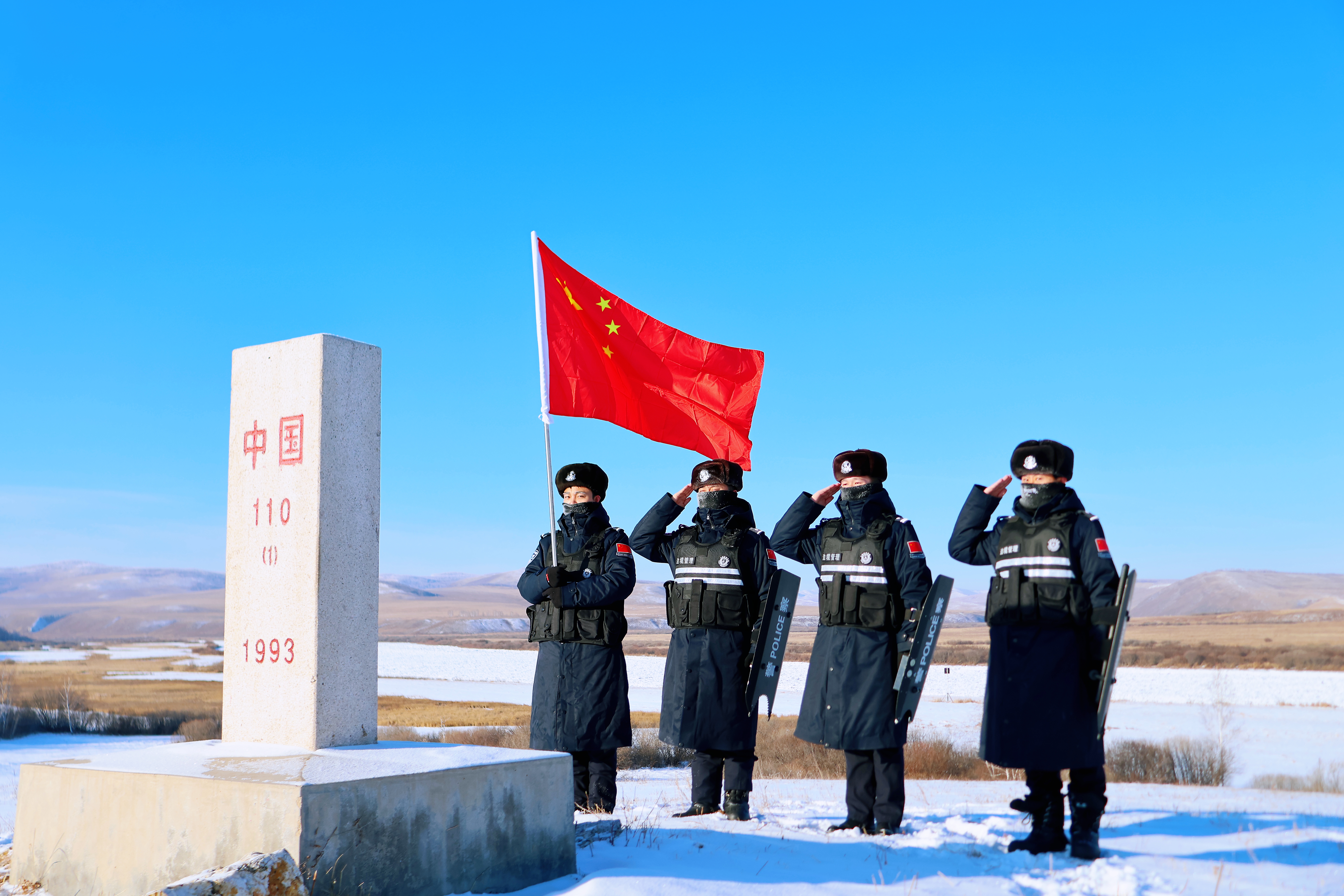 抵达界碑前,民警们小心翼翼地擦拭掉碑体上的积雪,用红漆为模糊的“中国”二字和界碑编号描红,让鲜红的印记在白雪皑皑中愈发醒目。随后,大家围站在界碑旁,郑重铺展开五星红旗,齐声许下戍边誓言,每一句都铿锵有力,回荡在寂静的雪原之上。